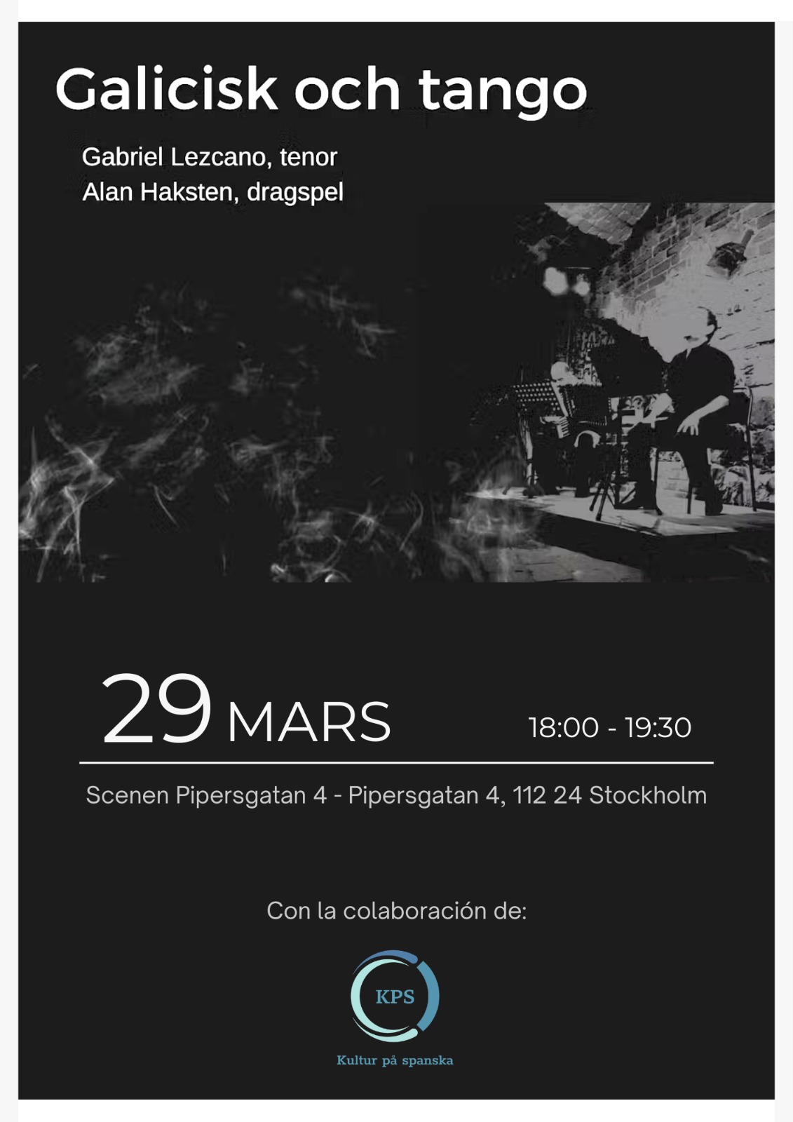 Gabriel Lezcano (tenor) y Alan Haksten (acordeón) presentan nuevamente su proyecto “Galiciskt och Tango”, donde interpretan dos estilos musicales diferentes pero cercanos: el tango y la música gallega. Presentarán nuevas canciones y, como siempre, contarán con artistas invitados especiales. Esperamos darles la bienvenida a una tarde mágica.