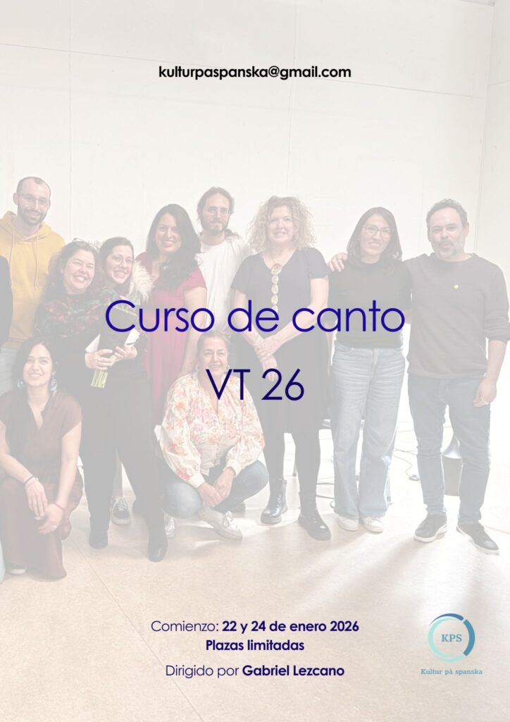 Kultur på spanska, organiza nuevamente el CURSO DE CANTO este vårtermin 26. La dinámica del curso consiste en un calentamiento vocal en grupo, trabajo técnico individual y repertorio a escoger entre el/la alumno/a y el profesor. El límite de personas tiene como objetivo un trato más personalizado en las clases y un trabajo técnico más específico. El curso está destinado tanto a principiantes como a personas que ya hayan tomado clases de técnica vocal anteriormente. El cupo es de 6 personas en cada grupo (una hora por cada grupo).