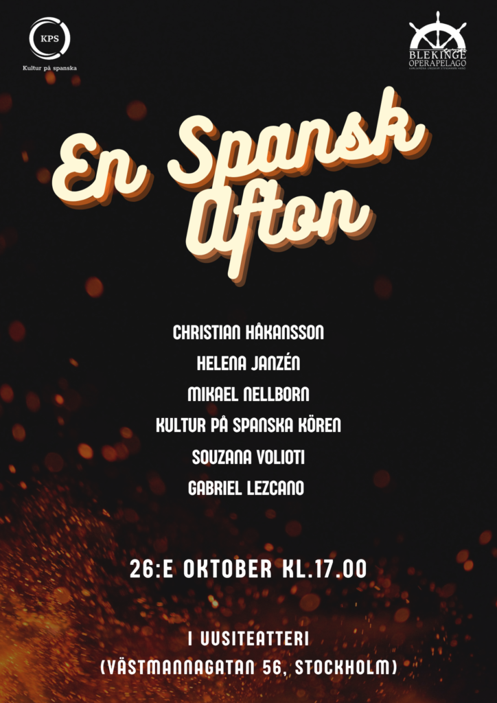Kultur på spanska i samarbete med Operapelago presenterar ”En spansk afton”, ett evenemang där vi framför musik av spanska kompositörer med zarzuela, spansk dans, kör och poesi. Medverkande: Helena Janzén (soprano), Gabriel Lezcano (tenor), Christian Håkansson (bas), Mikael Nellborn (piano), Souzana Volioti (dans) och vår Kultur på spanska kören.